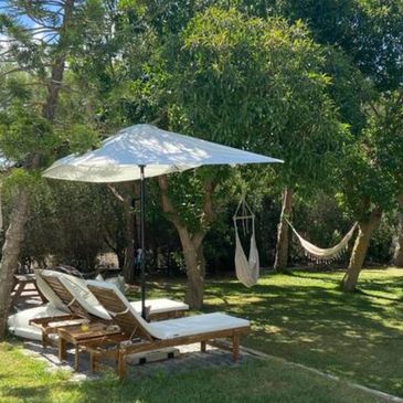 Cada Alojamiento tiene su zona de estar privada con comedor, zona chill out, tumbonas y hamacas y zona de BBQ.