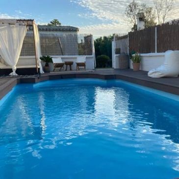 Los dias que sopla demasiado viento para poder disfrutar de la playa te invita una piscina con agua salada totalmente resguardada de viento. Un lugar donde puedes relajarte y refrescarte. Hay varias zonas de estar, tumbonas y una una cama balinesa.
